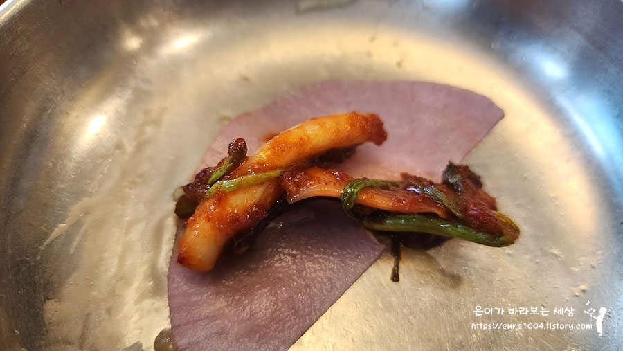 무쌈에 오징어를 넣고 싸서 먹어봅니다