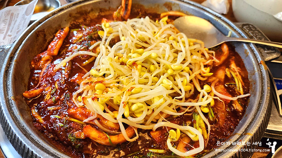 오징어가 어느 정도 익으면 콩나물을 넣어줍니다.