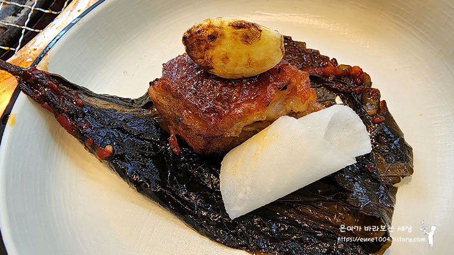 양념깻잎에 대장갈비 무쌈, 구운 마늘을 올려서~ㅋ