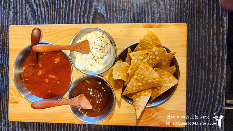 나쵸 먹고 있는 동안 메뉴가 나왔어요