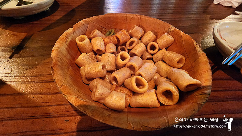 자리에 앉아마자 마카로니 뻥튀기를 줍니다