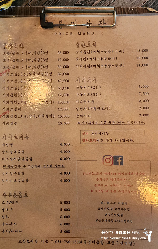 곱분이 곱창 메뉴판
