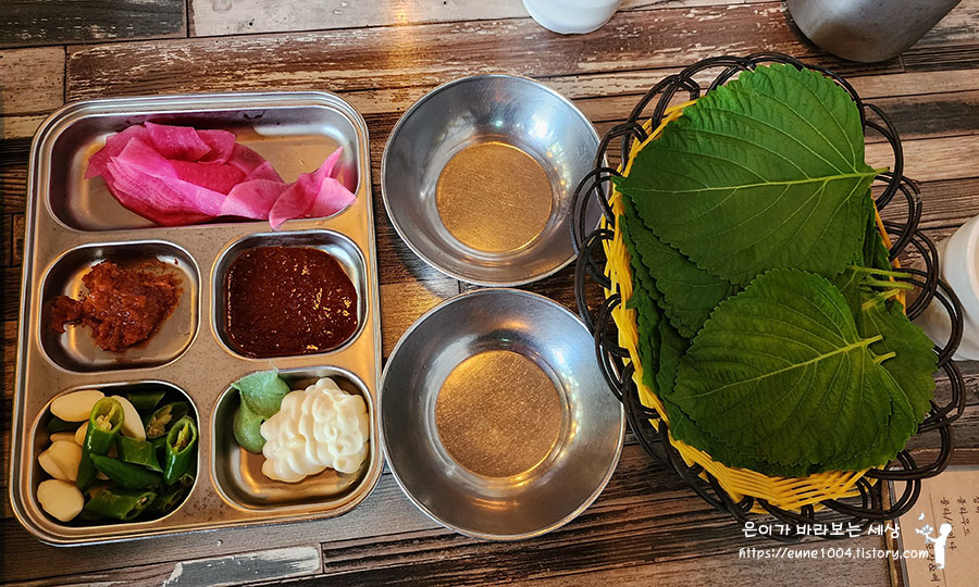 깻잎과 기본양념이 나왔어요
