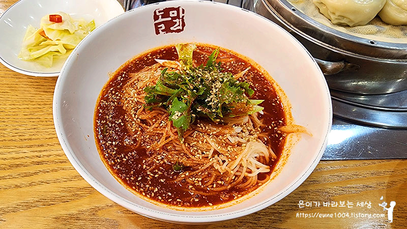 차가운 비빔국수와 만두 조합이 딱이었어요