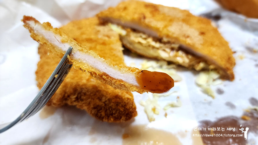 ②별도 증정된 소스를 뿌려 커다란 돈까스 패티를